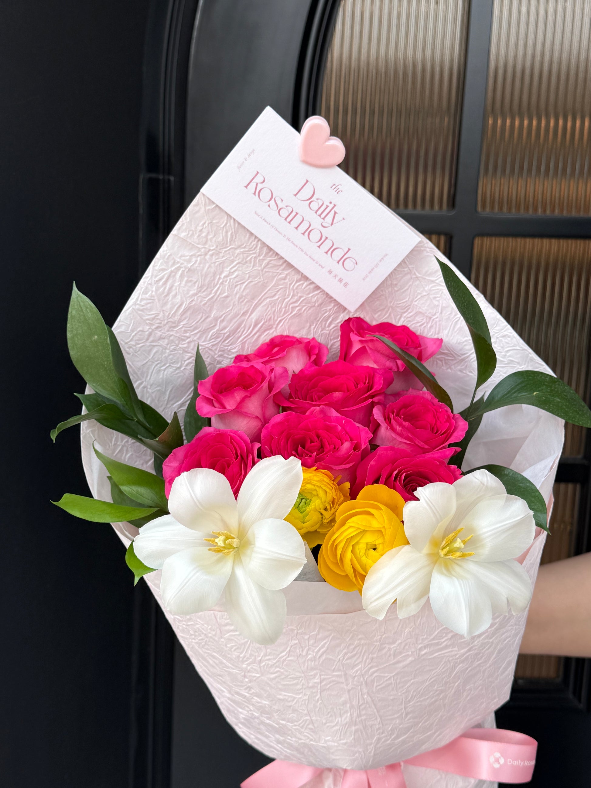 Our florists will thoughtfully create your bouquet using fresh seasonal blooms — including tulips — in a similar tone and style to the photo. Each arrangement is designed with care, and made just for you.